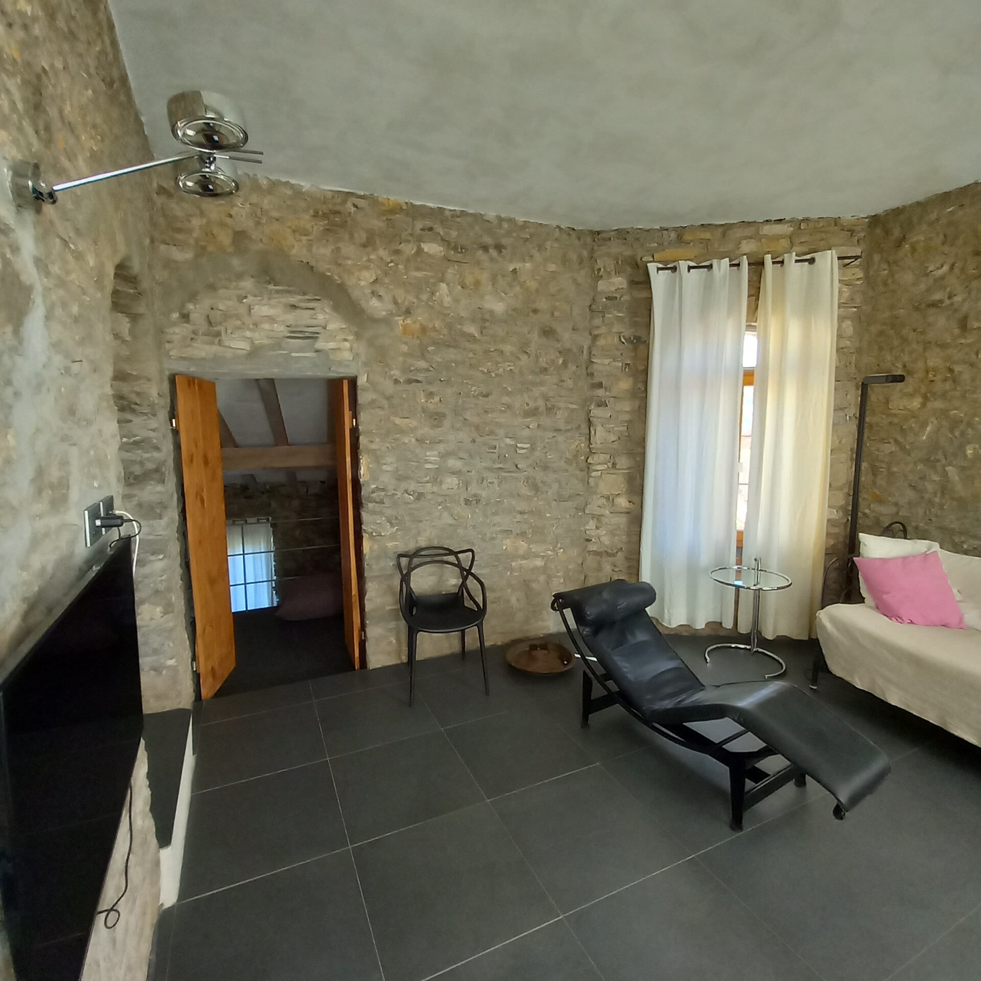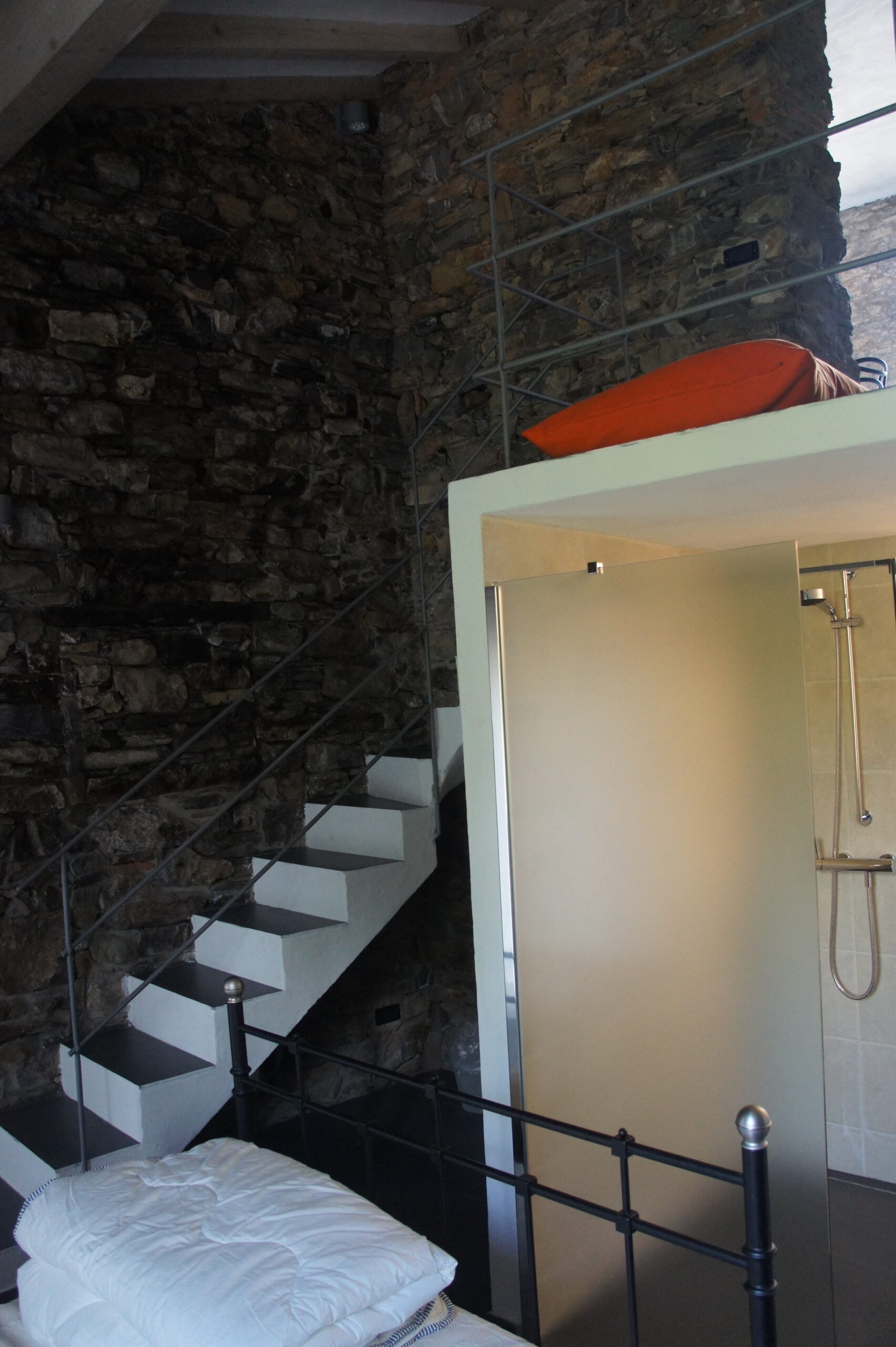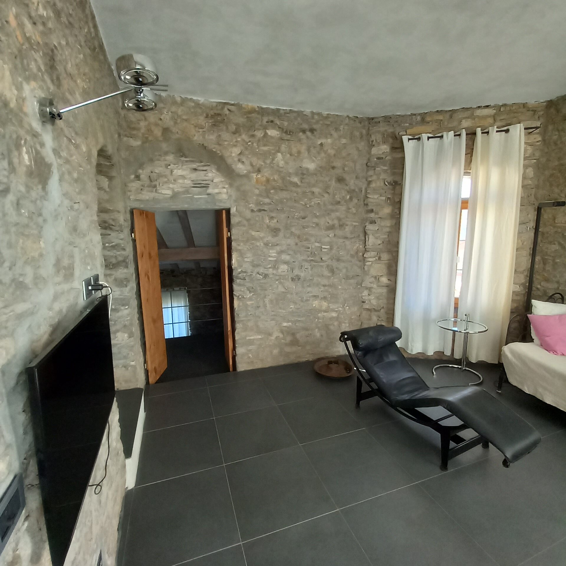 Im sich anschließenden Wohn-Treppenhaus fühlen Sie sich wie in einer Burg. Hohe Bruchsteinwände dominieren. Großzügig sind die Schlafbereiche im Haupthaus, eher klein und heimelig die der Dependence. Jeder Schlafbereich verfügt über ein eigenes Bad.