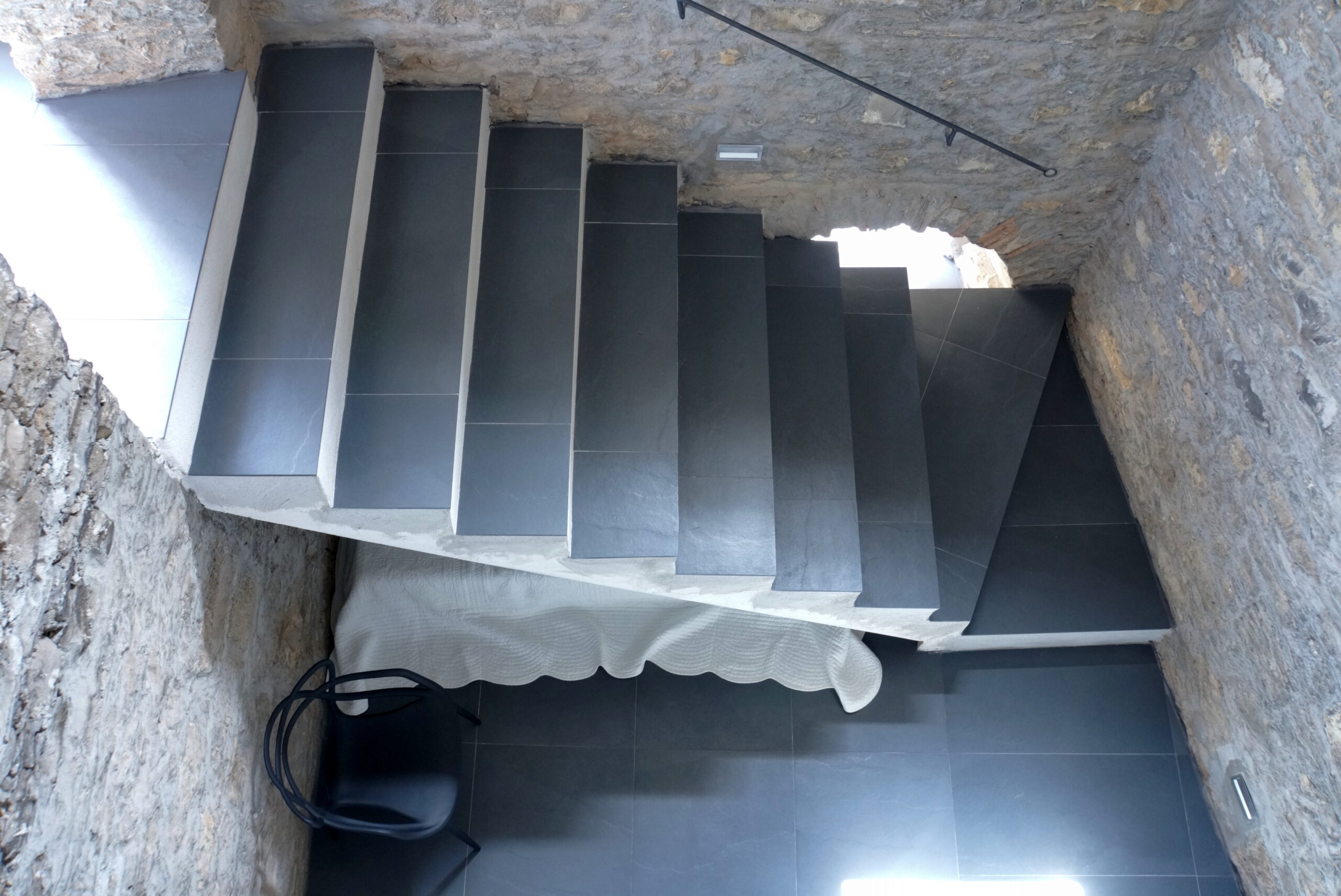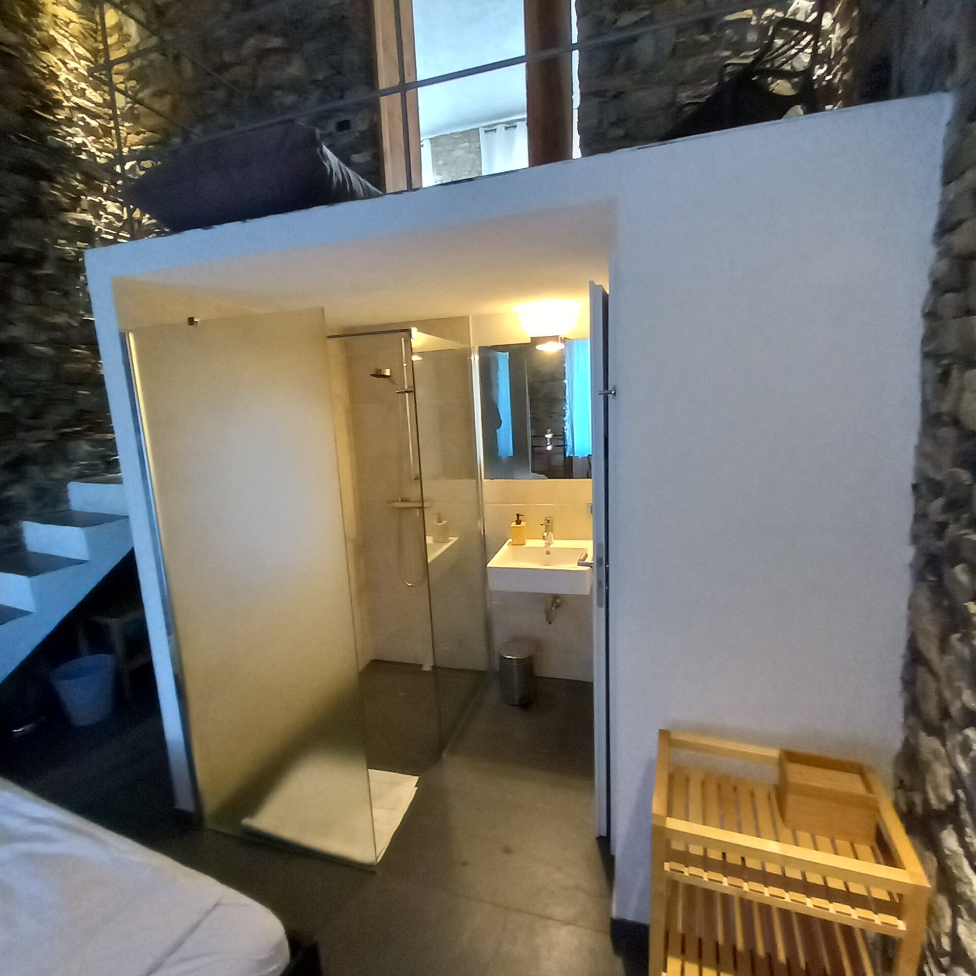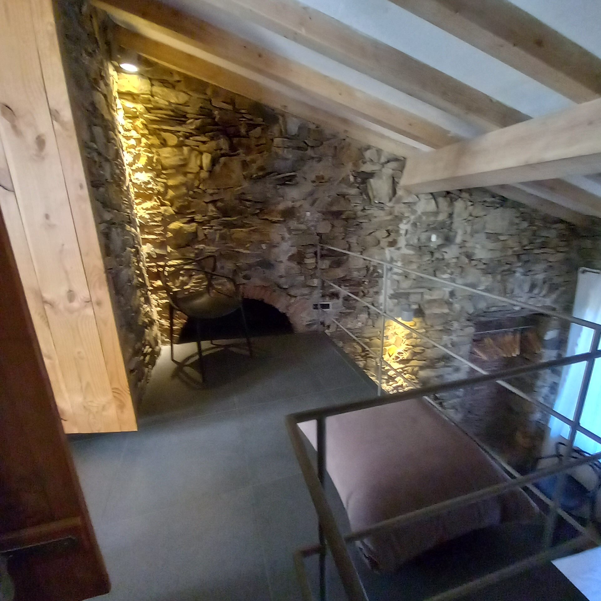 Im sich anschließenden Wohn-Treppenhaus fühlen Sie sich wie in einer Burg. Hohe Bruchsteinwände dominieren. Großzügig sind die Schlafbereiche im Haupthaus, eher klein und heimelig die der Dependence. Jeder Schlafbereich verfügt über ein eigenes Bad.