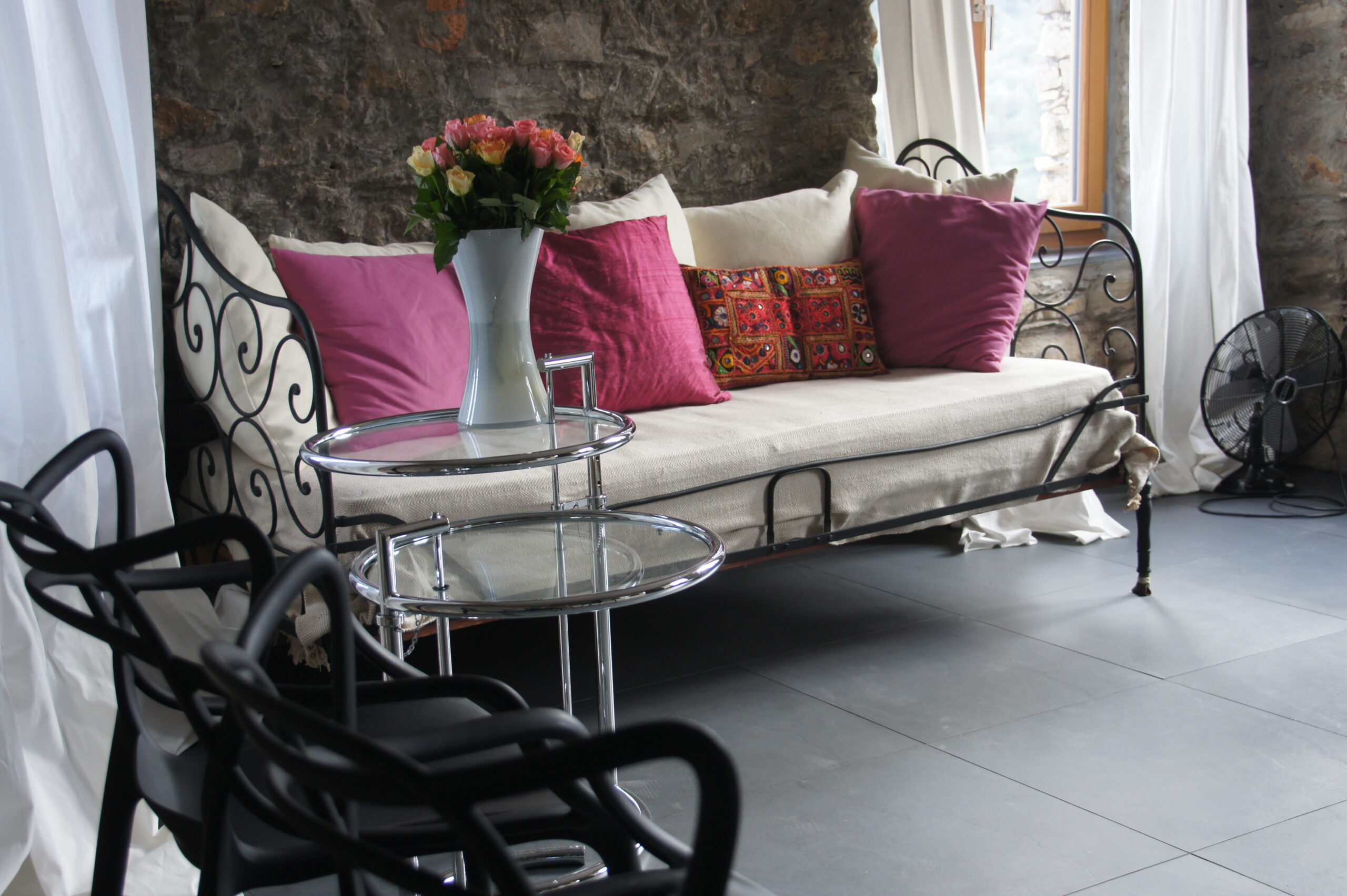 Im Wohnzimmer mit seinen Bruchsteinwänden finden 8 Personen bequem Platz. Hierher können Sie sich zu lange Gesprächen zurückziehen oder relaxen und den Ausblick durch die vier hohen Rundbogenfenster geniessen oder wenn das Wetter nicht ganz nach Ihren Wünschen ist, dann können Sie HDTV sehen, bei Brettspielen sich die Zeit vertreiben oder sich aus einer kleinen Handbibliothek Ihre Lektüre aussuchen. Bücher können Sie gerne mit nach Hause nehmen, wenn Sie dafür ein anderes, gleichwertiges im Haus lassen.