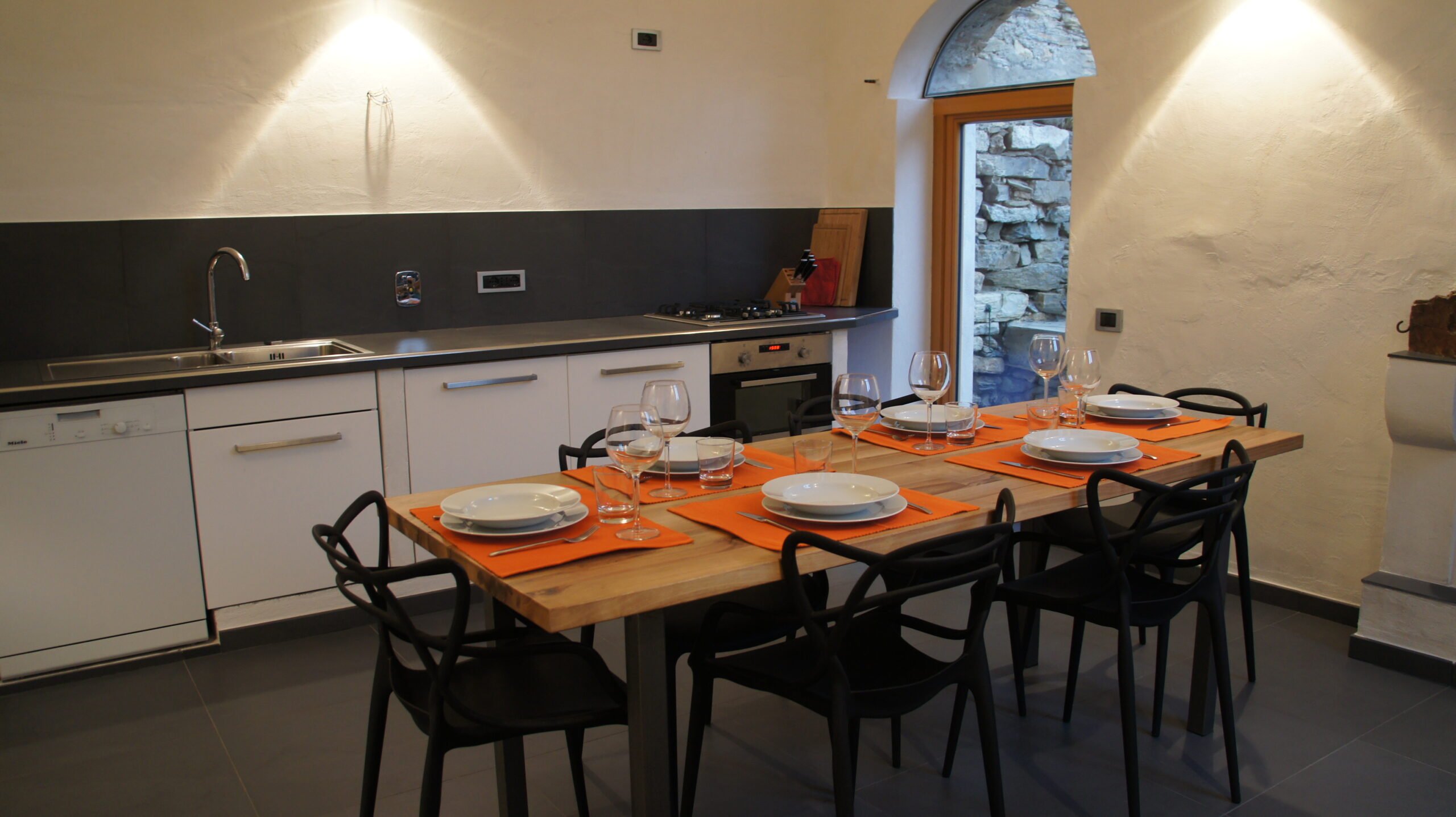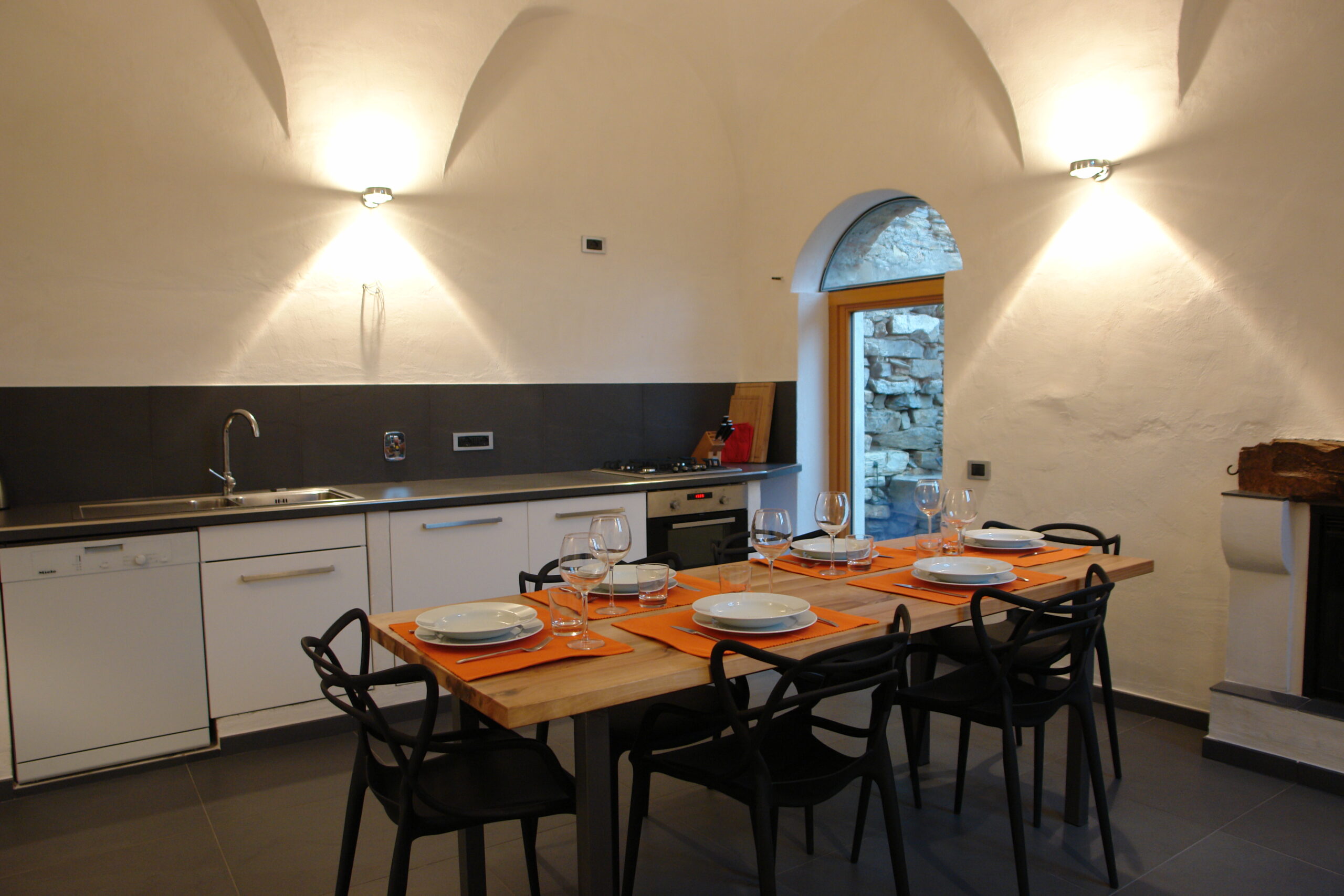 Die großzügige Wohnküche mit hohem Gewölbe und Kamin ist edel ausgestattet. Jeder ambitionierte Koch kann hier mediterane Köstlichkeiten kreieren. Der Nussbaumtisch bietet 6-8 Personen Platz. Lange Winterabende können Sie hier bei prasselndem Kaminfeuer geniessen.